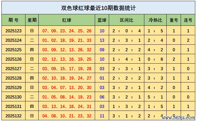 上期致密:双色球第2025132期开出奖号:红球04、08、10、21、23、32;蓝球11,其中红球三区比为3:1:2,开出0枚重号,开出0组连号,蓝球开出三区号码11。